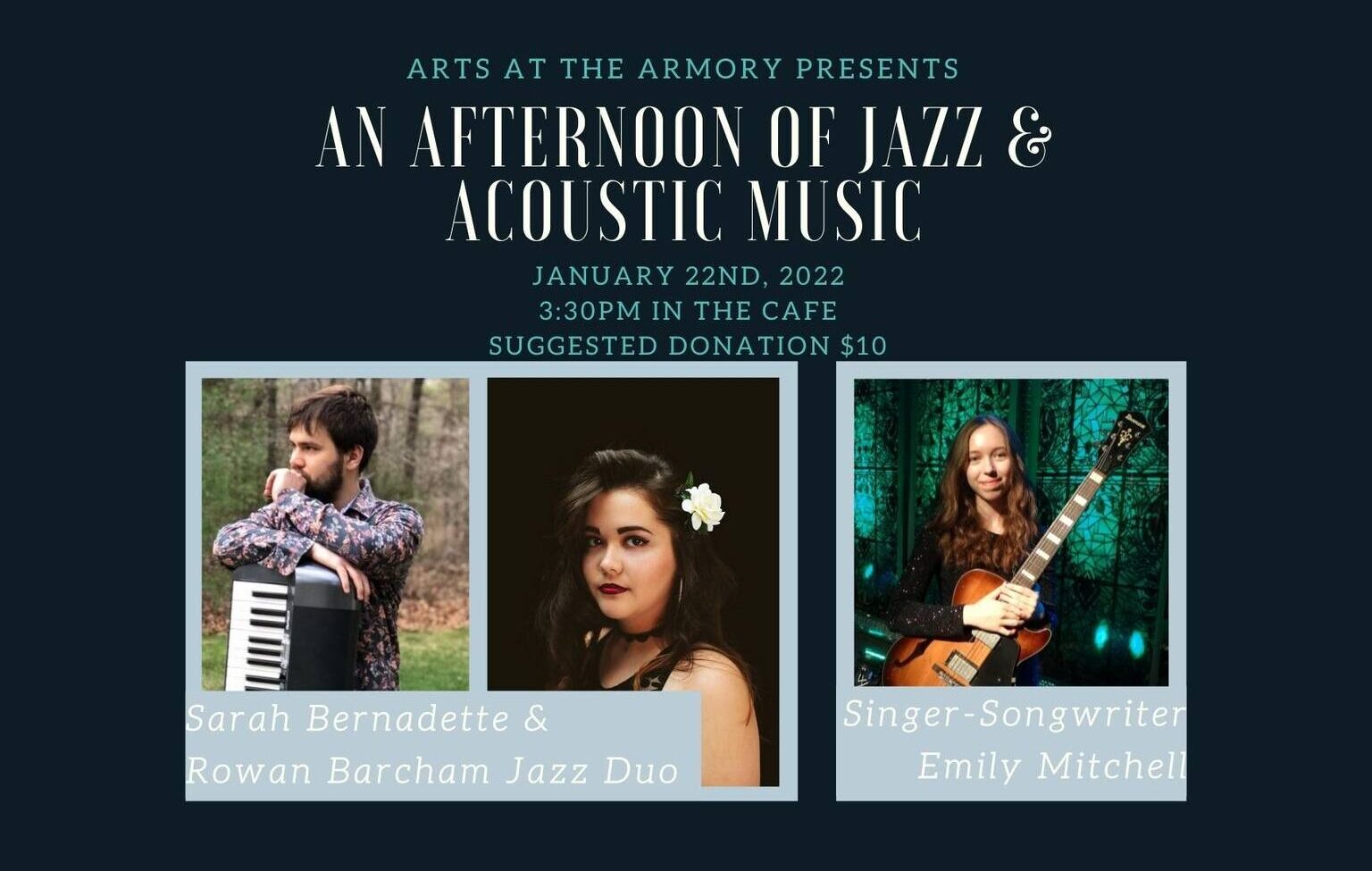 Join us for a low-key afternoon of standards, original music, and more! Featuring singer-songwriter Emily Mitchell and piano vocal jazz duo Sarah Bernadette + Rowan Barcham.