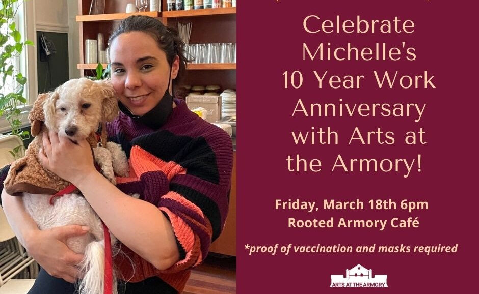 Michelle began working with Arts at the Armory in February 2012. Over the years, many of our community members have gotten to know and love Michelle’s welcoming presence, and her talent in baking and food preparation. In December 2019, she was promoted to Assistant Cafe Manager, and in May 2021 she was promoted to Cafe Manager. Currently she manages the day-to-day operations of the Cafe, where we have been receiving consistent 5-star reviews. She also recently innovated a new Bar menu for the Performance Hall. One word—yum!! We hope that you can come out for this special occasion in acknowledgement of our longest employed and greatly valued staff member!