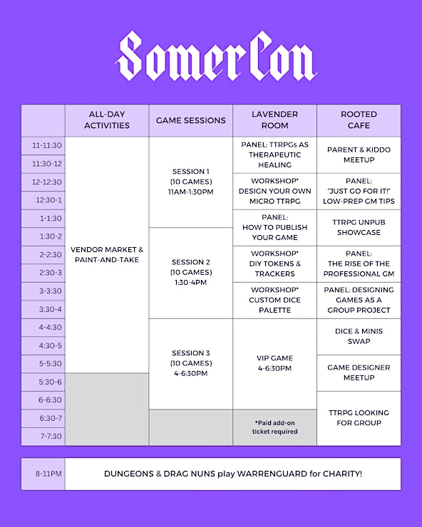 – YOU MUST HAVE AN ADD-ON RSVP for game sessions. You may only sign up to play in two games during SomerCon.