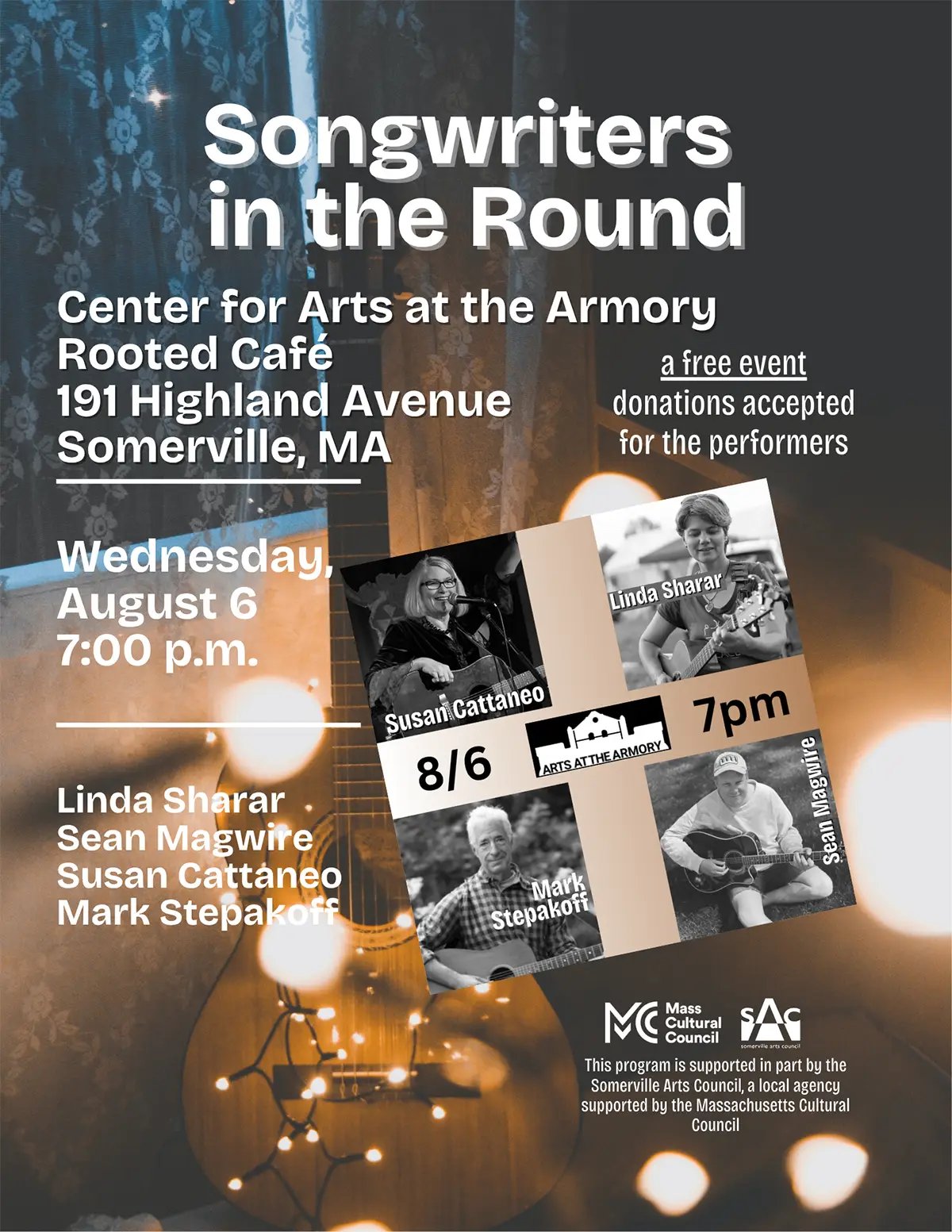 Held on the first and third Wednesdays of each month from 7:00-8:30 p.m. This program is supported with a small grant from the Somerville Arts Council, a local agency supported by the Massachusetts Cultural Council. The event is free but you may want to donate $10-$20 for the performers.