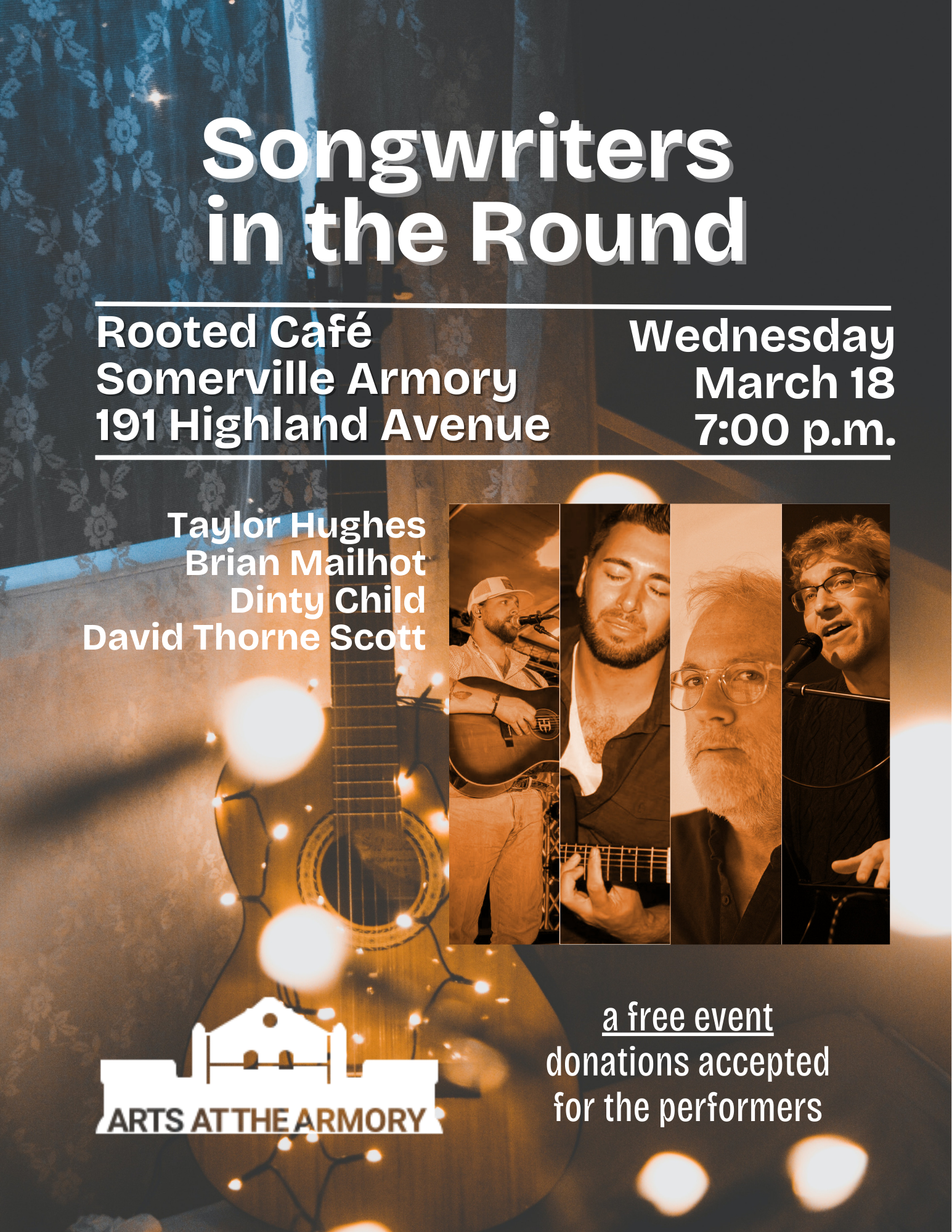 Your host, David Thorne Scott, is a singer and songwriter in jazz and Americana styles. A longtime resident of Somerville, he organized Songwriters in the Round to foster a creative, dynamic music scene here. He believes that music can bring a community together like nothing else. “At a time of great conflict in our country – when words often fail us – music has the power to bridge divides… David Thorne Scott explores the intersection of Jazz and Americana, city and country, instrumentation and lyrics to create lush compositions and covers that are unifying, and healing, in their beauty.” – Laurie Fanell, Eponymous Review www.davidthornescott.com